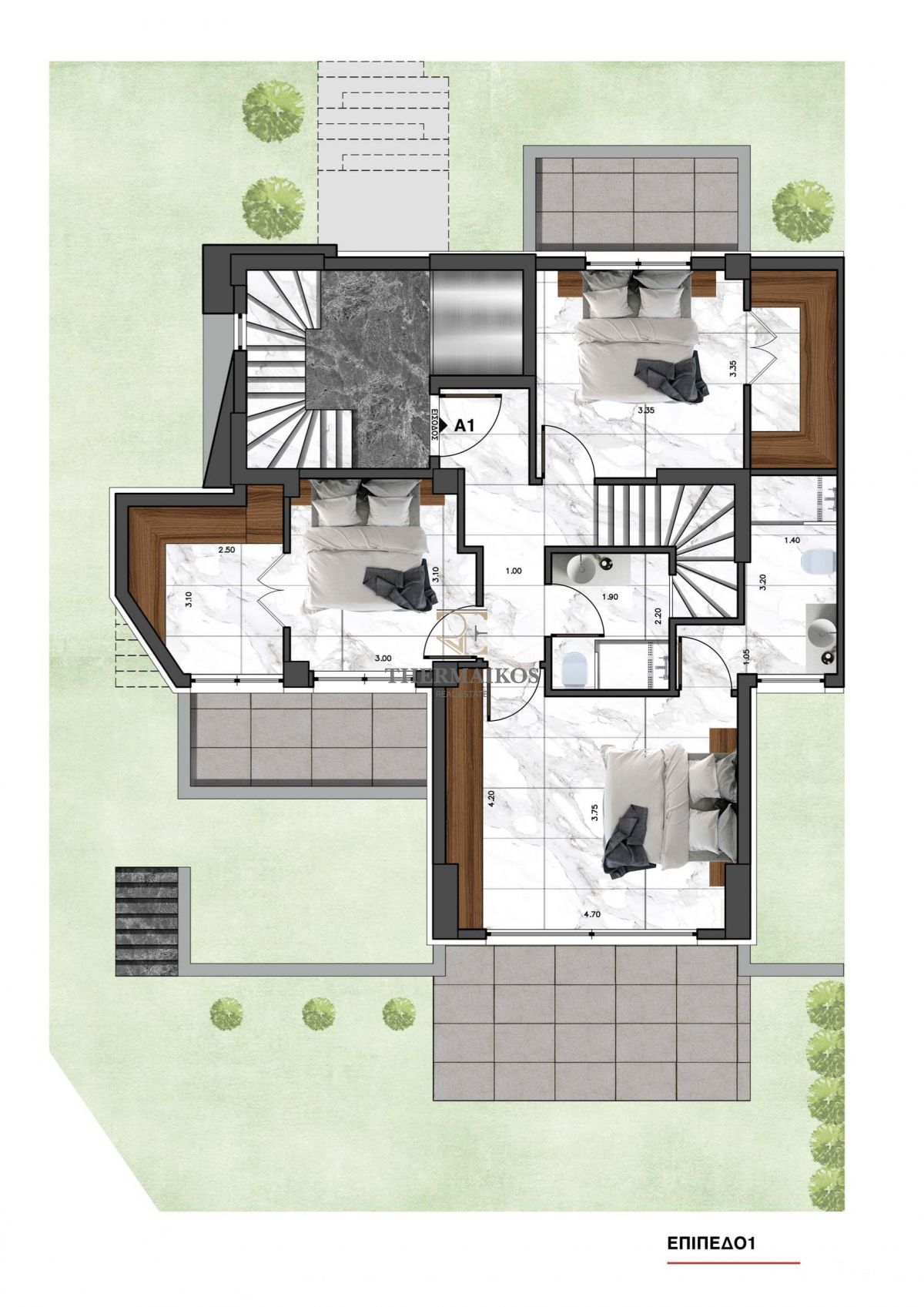 - Το 1οεπίπεδο ισογείου αποτελείται από 3 υπνοδωμάτια με ντουλάπες, βεστιάριο, 2 μπάνια