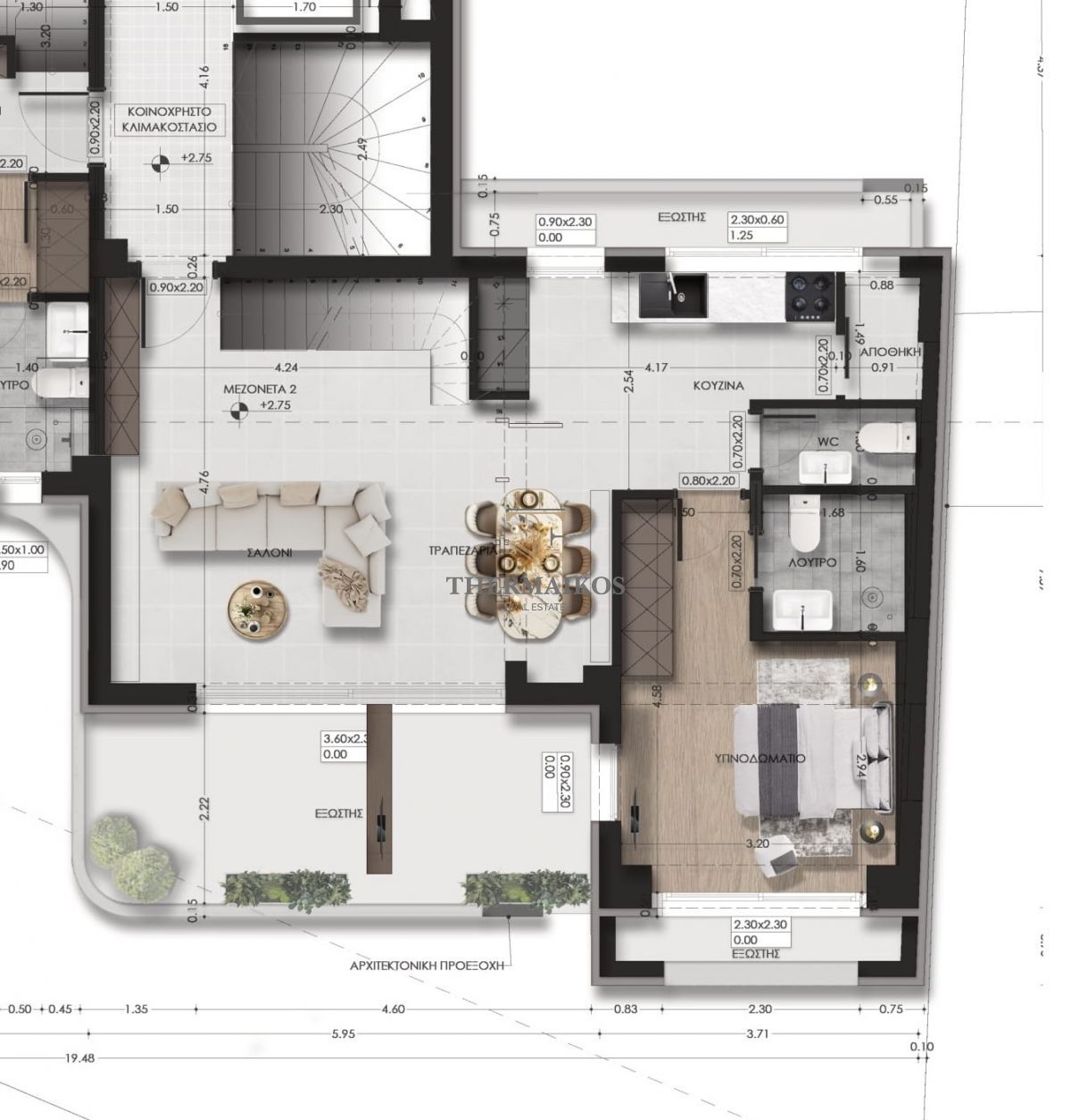 Είναι διαρρυθμισμένο σε 2 επίπεδα με εσωτερική σκάλα.