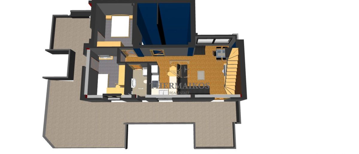 Είναι διαρρυθμισμένο σε 2 επίπεδα με εσωτερική σκάλα. Αποτελείται από 3 υπνοδωμάτια με ντουλάπες, σαλοκουζίνα, 1 μπάνιο και 1 WC. Επιπλέον διαθέτει βεράντα, αποθήκη, σοφίτα και θέση στάθμευσης.